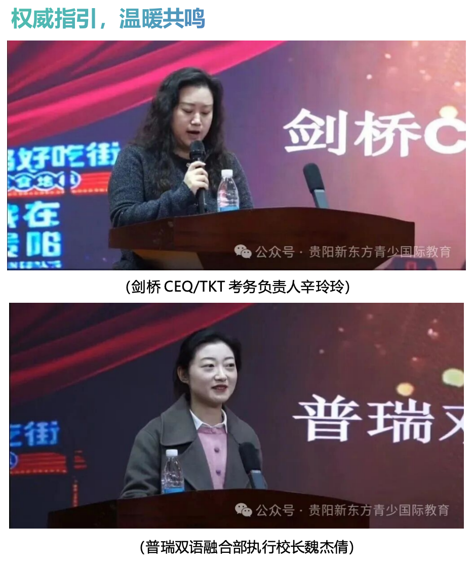 决赛现场,评委团中的剑桥CEQ/TKT考务负责人辛玲玲、普瑞双语融合部执行校长魏杰倩依次上台讲话,从国际化语言表达、青少年成长赋能等专业视角,为小选手们送上鼓励与指引。