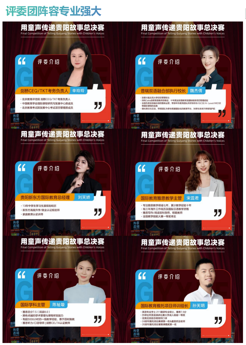 本次决赛评委团阵容专业强大,由剑桥CEQ/TKT考务负责人辛玲玲、普瑞双语融合部执行校长魏杰倩、贵阳新东方国际教育总经理刘天娇、国际教育雅思教学主管宋蕊君、国际学科主管陈祉璇、国际教育雅托项目师训组长孙天玥六位专业人士组成。