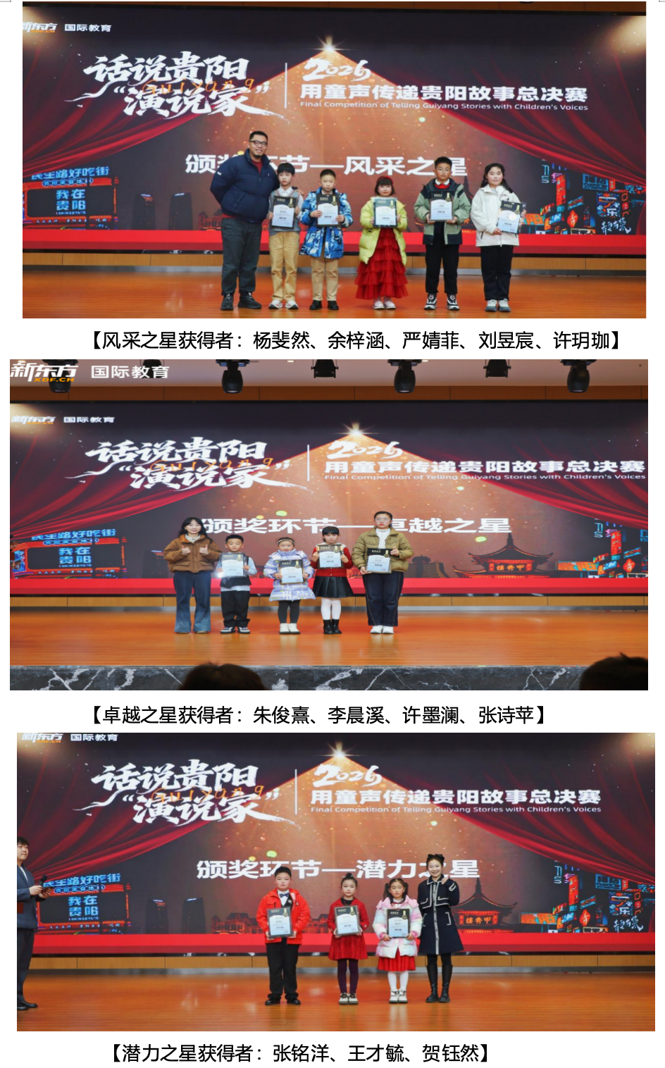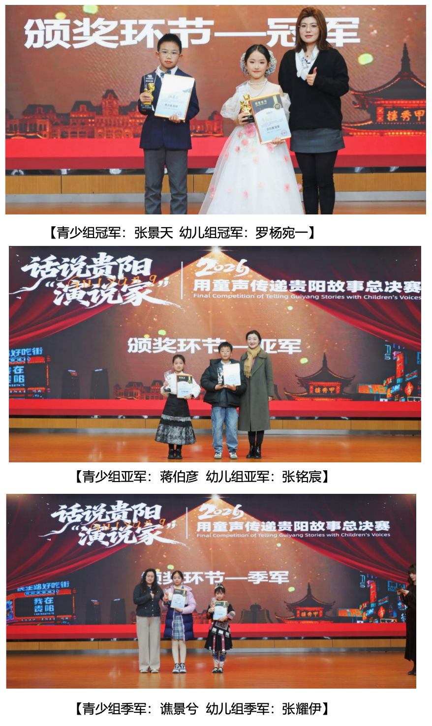 感谢每一位小选手的勇敢发声,让我们听到了贵阳少年的国际化风采;感谢每一位家长的细致陪伴与全力支持,做孩子最坚实的后盾;感谢六位专业评委的悉心点评与权威指引,为比赛保驾护航;感谢优秀家长代表的真诚分享,传递陪伴的力量;感谢辅导老师们的悉心指导,陪伴孩子在成长路上稳步前行;更感谢贵州广播电视台及动静贵州文体旅的专业加持,让更多人听见贵阳的声音。