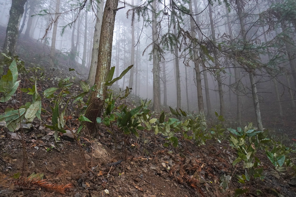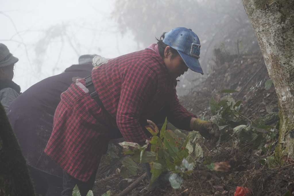 这两天,在剑河县太拥镇白道村八万山中药材种植基地,村民们正趁着潇潇细雨,在云雾缭绕的林间种植中药材。