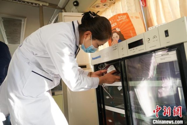 图为采血工作人员将血样放入冰箱临时保存。马铭言 摄
