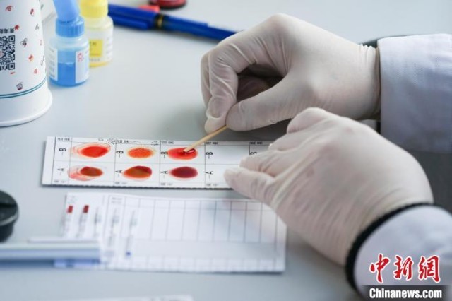 图为采血工作人员为献血者检测血型。马铭言 摄