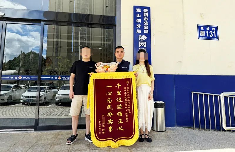 近日,群众罗先生将一面印着“千里追赃维正义 一心为民办实事”字样的锦旗送到了贵阳市公安局观山湖分局涉网违法犯罪侦防中心,感谢反诈民辅警帮其挽回被骗损失。