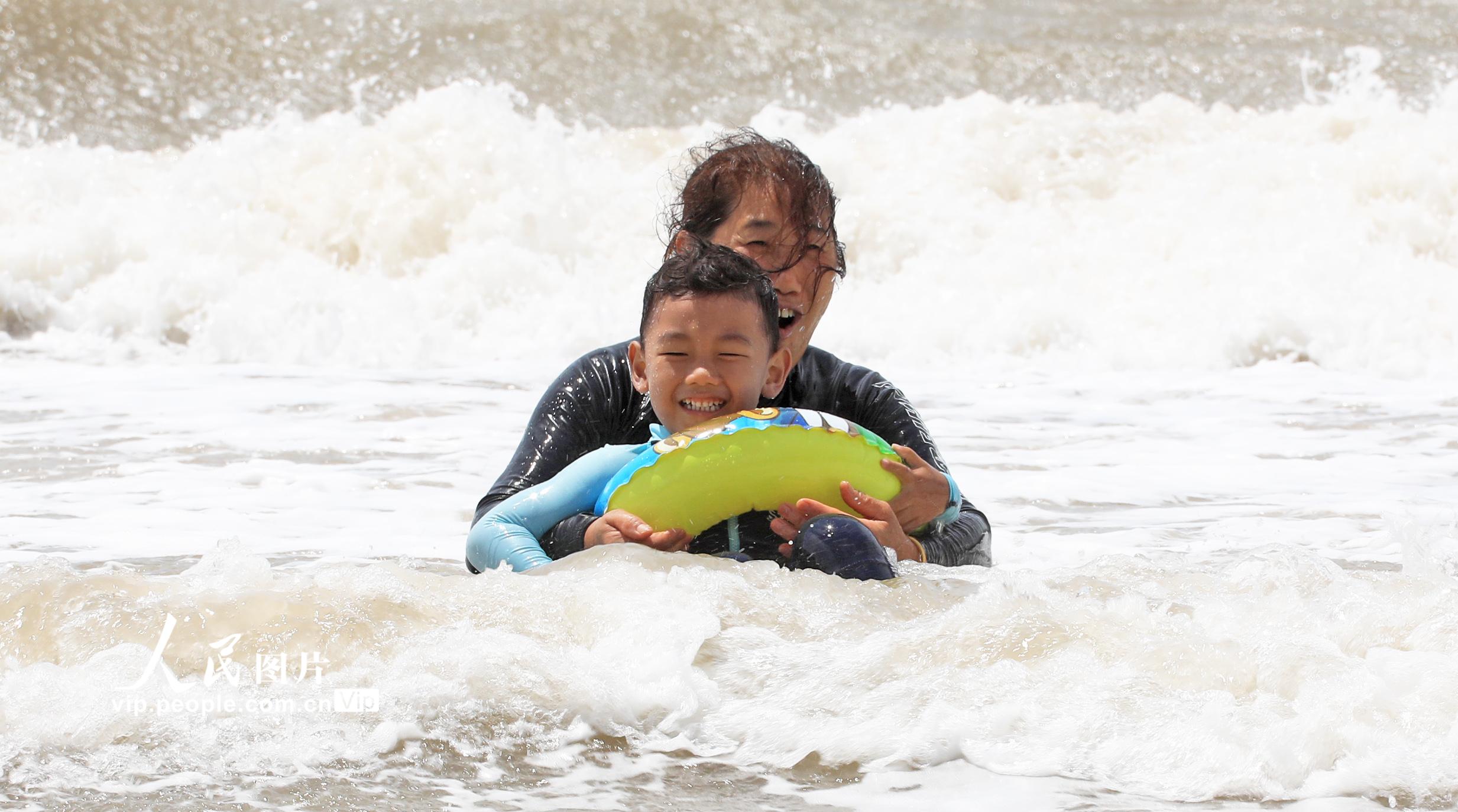 6月28日,在舟山市朱家尖南沙景区,游客在海滨浴场避暑纳凉。