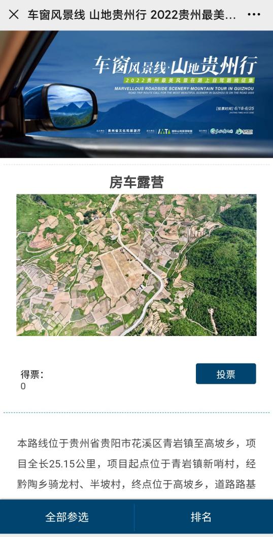 “车窗风景线•山地贵州行”2022贵州最美风景在路上自驾路线评选活动是2022国际山地旅游日的子活动之一,于5月29日国际山地旅游日当天面向全省,征集包括房车露营、峡谷探险、休闲康养、民俗风情、非遗传承、乡村田园、亲子研学等不同主题的贵州自驾线路。目前共征集到近百条贵州自驾线路,经过初筛,共38条线路进入网络投票环节。