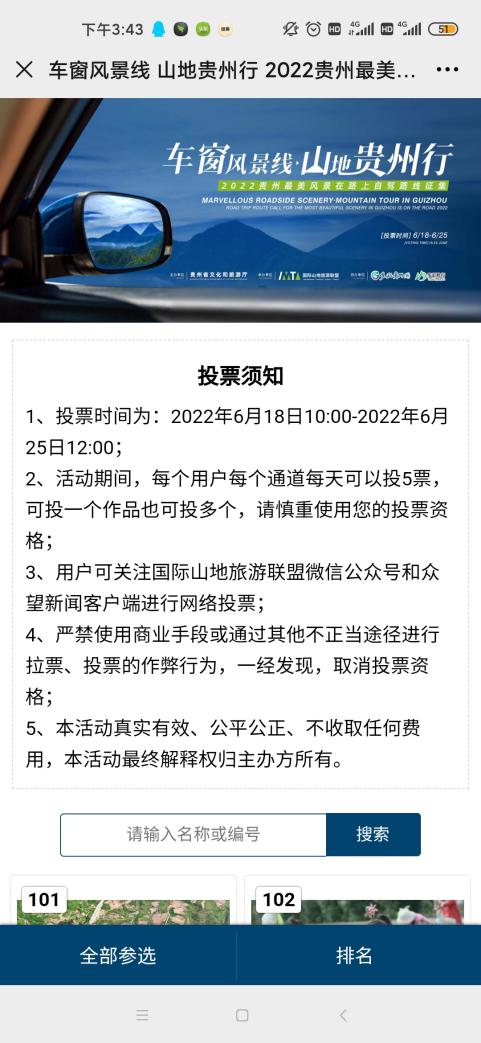 投票从6月18日10:00开始,持续至6月25日12:00。期间,公众可关注“国际山地旅游联盟”微信公众号或进入众望新闻客户端,对各市州推选参评的自驾路线进行网络投票,每个微信号一天限投5票。网络评选过程中,主办方将全程严格把关投票活动,实时统计投票数据,严禁出现恶意刷票等舞弊行为,若有违反将取消参赛资格。