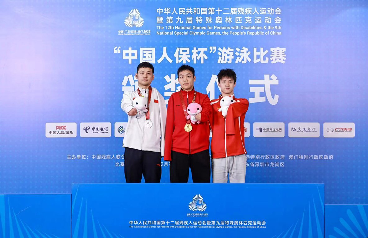 贵州运动杨洪(中)获第十二届全国残运会暨第九届特奥会男子200米个人混合泳SM6级项目金牌