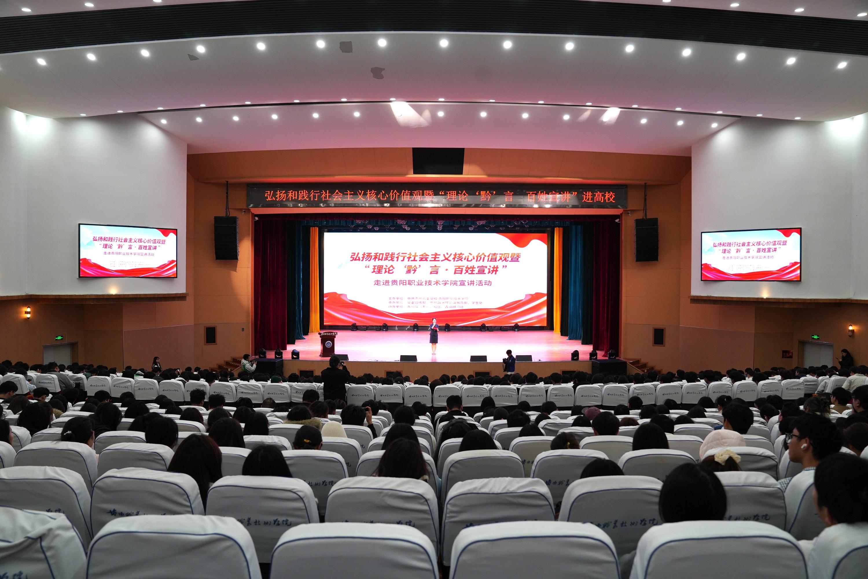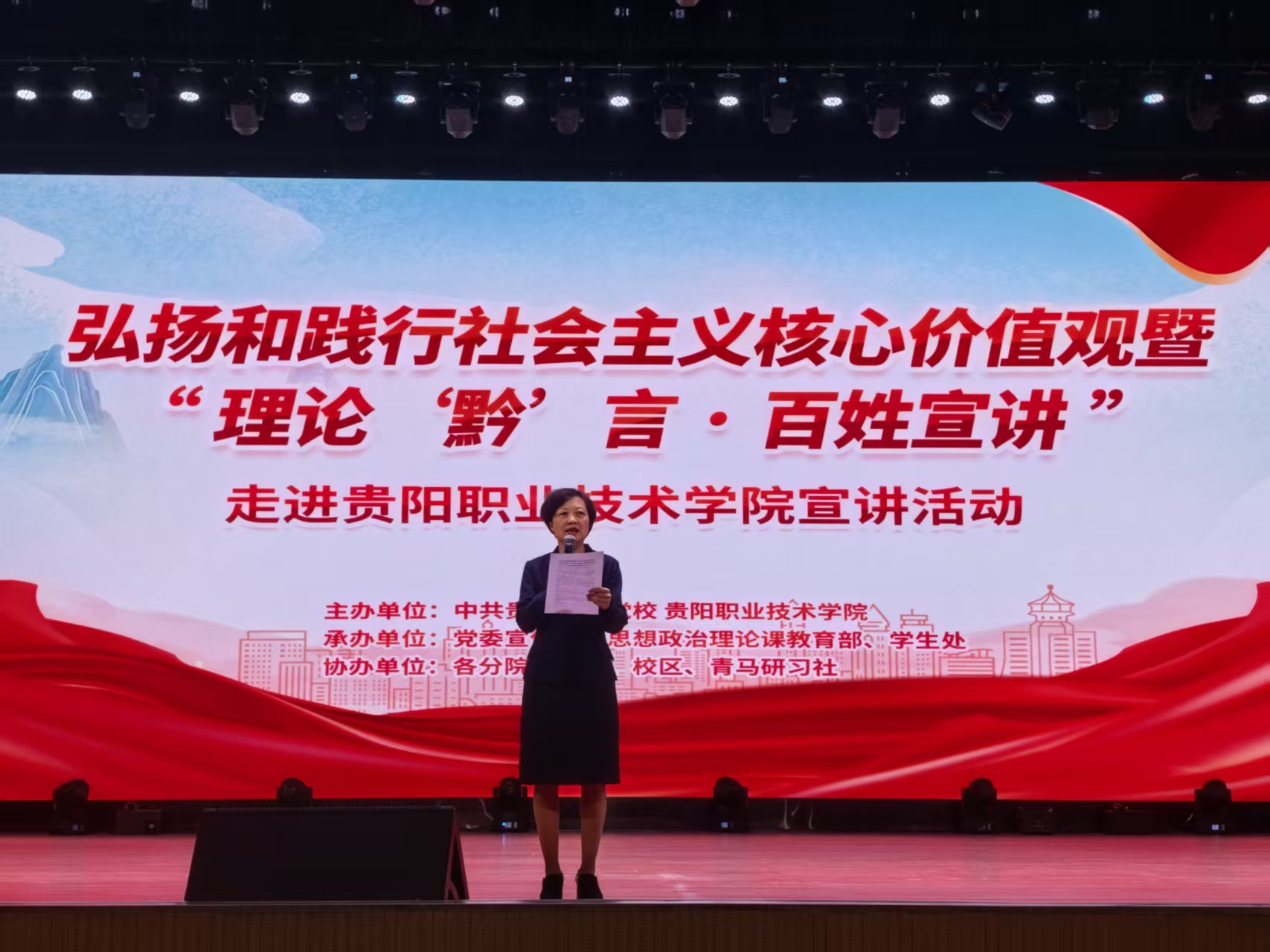 为深入贯彻落实党的二十届四中全会和省委十三届八次全会精神,弘扬和践行社会主义核心价值观,加强校园思想政治工作,引导青年学子扣好人生“第一粒扣子”,3月13日下午,由中共贵州省委党校(贵州行政学院、中共贵州省委讲师团)组织开展的弘扬和践行社会主义核心价值观暨“理论‘黔’言·百姓宣讲”走进贵阳职业技术学院宣讲活动,在贵阳职业技术学院大礼堂举行。