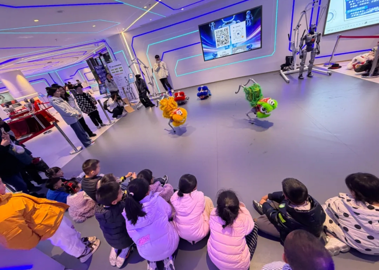 孩子们在“全球首家机器人6S店”贵州首店观看机器狗舞狮表演