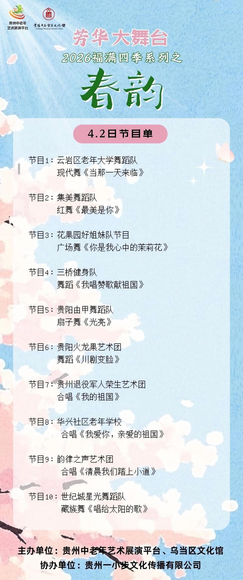 4月2日,“芳华大舞台——2026福满四季系列之‘春韵’” 第二场展演在贵阳市乌当区文化馆如约上演。继首日的热烈反响后,又一批来自贵阳各区的中老年艺术团队接续登台,用饱满的热情和精湛的表演,为春日增添了一抹动人的艺术亮色。