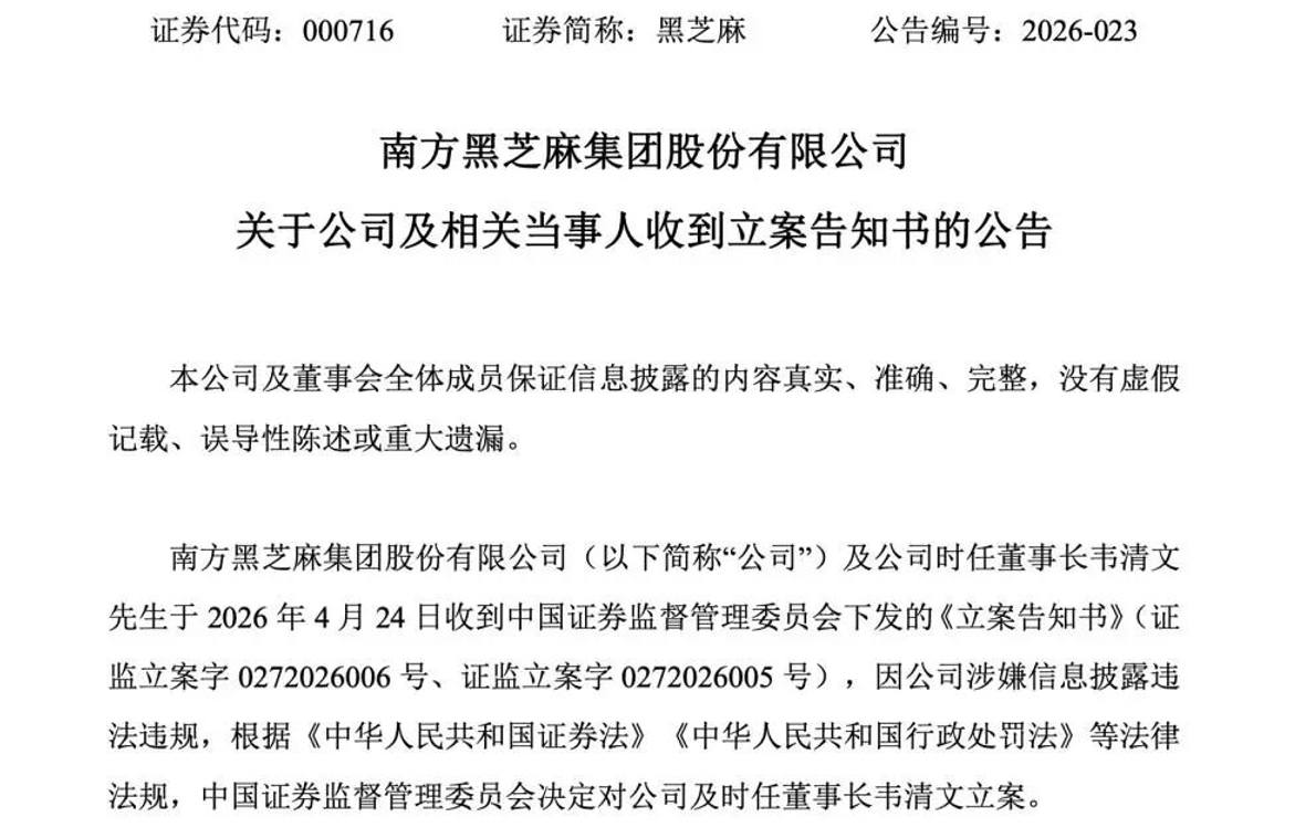 近日,南方黑芝麻集团股份有限公司(简称“黑芝麻”,000716.SZ)发布公告称,因公司涉嫌信息披露违法违规,中国证监会决定对公司及公司时任董事长韦清文立案调查。