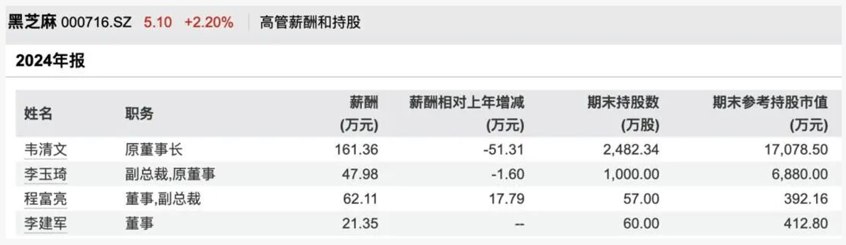 作为企业创始人,韦清文是黑芝麻发展的核心人物。他现年66岁,高级经济师,从2004年10月起长期担任上市公司董事长职务,直至2024年8月卸任。根据2024年年报,韦清文年薪为161.36万元,期末持股数量为2482.34万股,对应参考市值约1.71亿元。