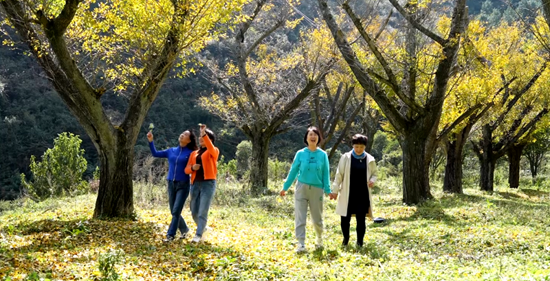 游客谢女士:今天我们是特意跑到这里来,九坎这个地方,这个风景特别好,而且叶子特别黄,特别是风刮起来树叶飘起来感觉很好的,大家心情都特别好,感觉是生活充满了阳光。