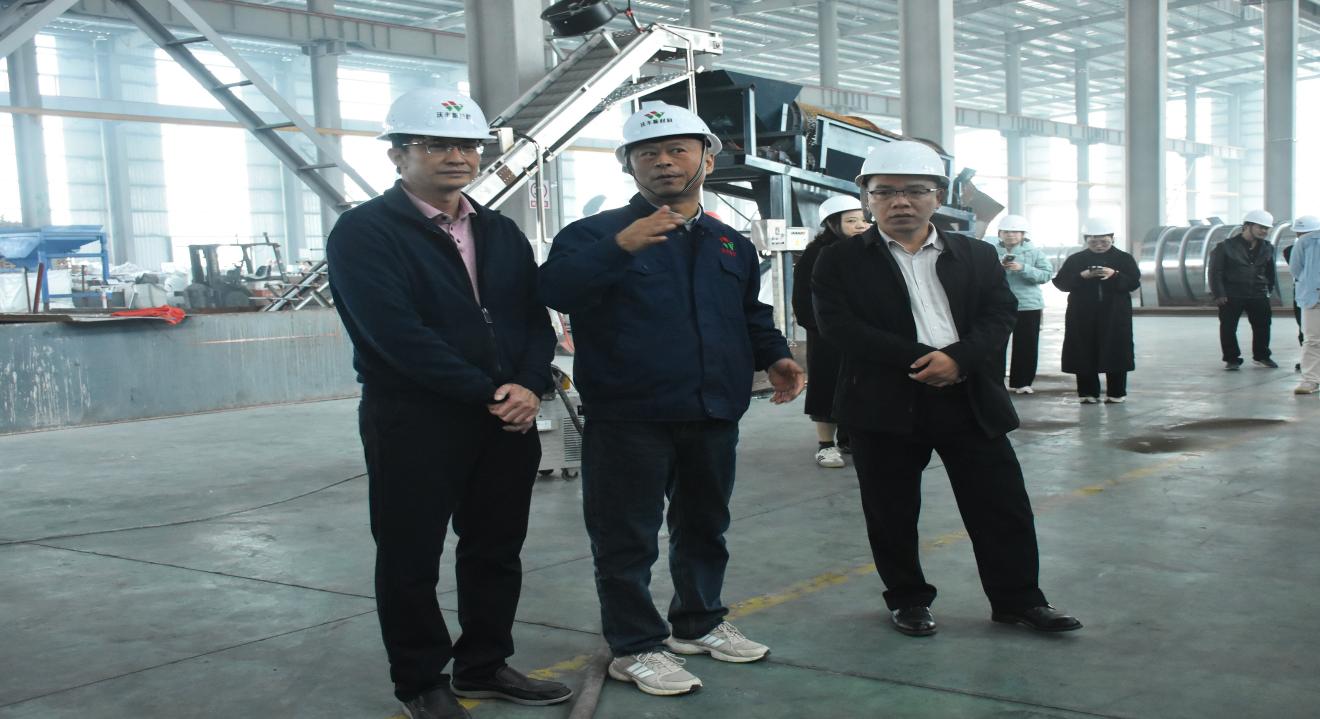博罗县委常委、副县长黄剑波(左)和兴仁市委常委、副市长李文博(右)听取曾海峰(中)汇报生产情况