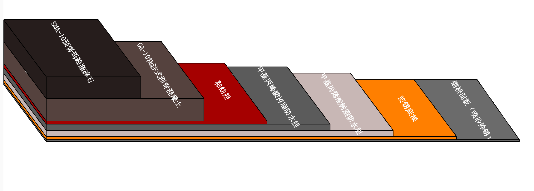 接下来,在防水层上一层GA-10浇注式沥青混凝土,这是一种高沥青含量、高矿粉含量、空隙率小于1%的沥青混合物,具有密实不透水、随从变形能力强、施工无需碾压等特点。接着上SMA-10沥青玛蹄脂碎石。这一层在普通改性沥青SMA-10的基础上,采用高弹改性沥青拌合后,它的高温稳定性和低温抗裂性都更好,更能适应钢桥面的弹性形变。