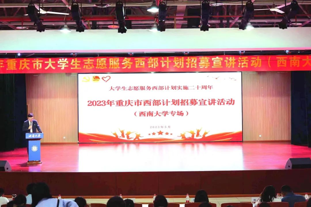今年是大学生志愿服务西部计划实施20周年,为进一步促进在校毕业生全方位了解西部计划,踊跃投身西部建设,近日,重庆市大学生志愿服务西部计划招募宣讲活动在西南大学举行。重庆市志愿服务工作指导中心党支部书记、主任龙江,江北区、北碚区、大渡口区、长寿区、江津区、永川区、綦江区、大足区、铜梁区等9个区县团委相关负责人,优秀西部计划志愿者代表参加此次招募宣讲会。