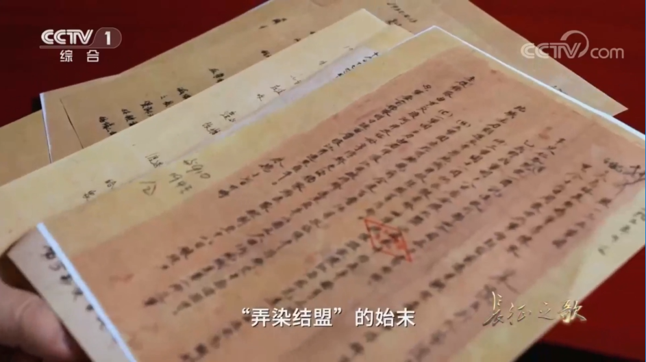 军事科学院研究院 江英:这里是中央档案馆的4封电报,通过这些电报,我们就可以看出来“弄染结盟”前前后后所发生的事情。这个布依族有个首领叫做陆瑞光,他们因为没有跟共产党,跟红军没有接触过,他们就跑到山里去了。军团长彭德怀、政治委员杨尚昆、红军总政治部代主任李富春,亲自到弄染寨去联系,结果这个陆头领还是受感动,就下山了,同意帮助红军渡过北盘江。这样的话,我们就看到这一份电报是特别珍贵的一份电报。它原文是这样的:一首领陆瑞光,我们跟他们订立了作战协定,也就是反蒋(介石)、反王(家烈)、反犹(国才),反对国民党及苛捐杂税,这就是“弄染结盟”的最重要的一个电报。