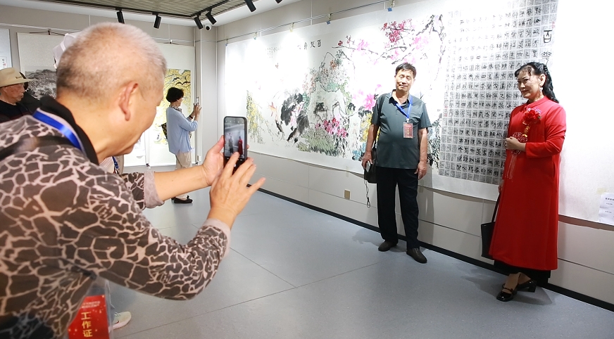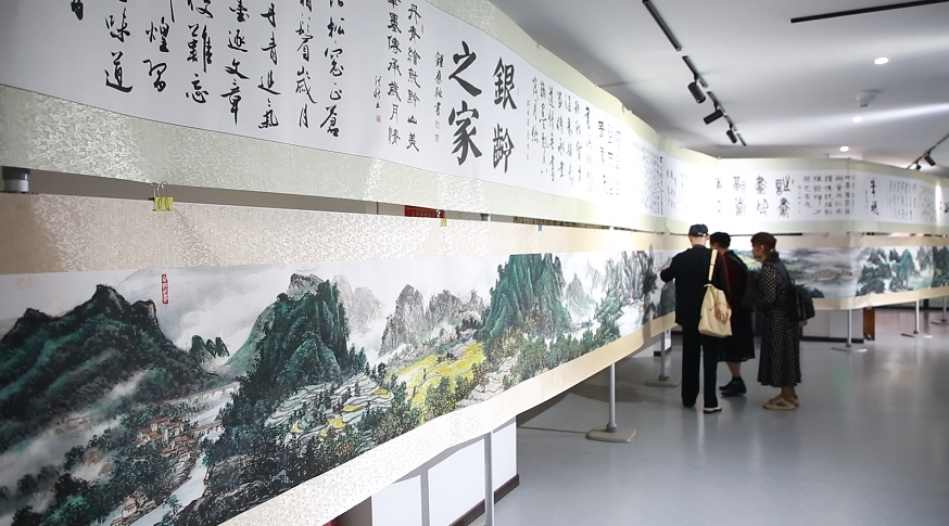 其中,为纪念研究会成立四十周年特别创作的四幅精品力作尤为引人注目——40米长卷《旖旎红水河》以细腻笔触勾勒红水河流域的秀丽风光,40米《书法》长卷汇聚不同书体的经典篇章,另有《百花齐放图》《牡丹图》两幅国画作品尽显生机与雅致。这些作品将黔山秀水的自然之美与贵州深厚的人文底蕴巧妙融合,引得观展者纷纷驻足欣赏、拍照留念。