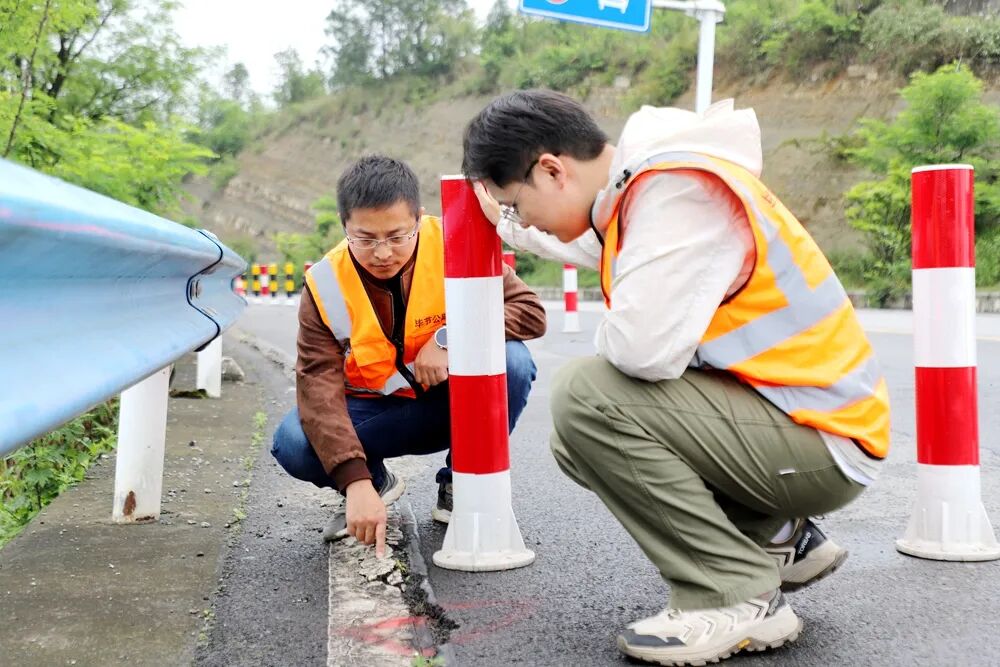 此后,养护升级工作持续稳步推进:2018年实施六广河至大方沙子坡路段路面改造工程、2022年精准实施多段修复性养护与预防性养护、2025年实施公路沥青路面改善工程等持续提升路况水平。更引入智慧元素:近万颗高亮反光道钉(A3凸起路标)守护夜间行车,BJ-100桥梁快速修补材料提升耐久性,关键弯道超车预警系统系牢“安全带”。边坡碎落台、花池道牙点缀其间,编织出“春有花、夏有景、秋有色、冬有绿”的生态画卷。