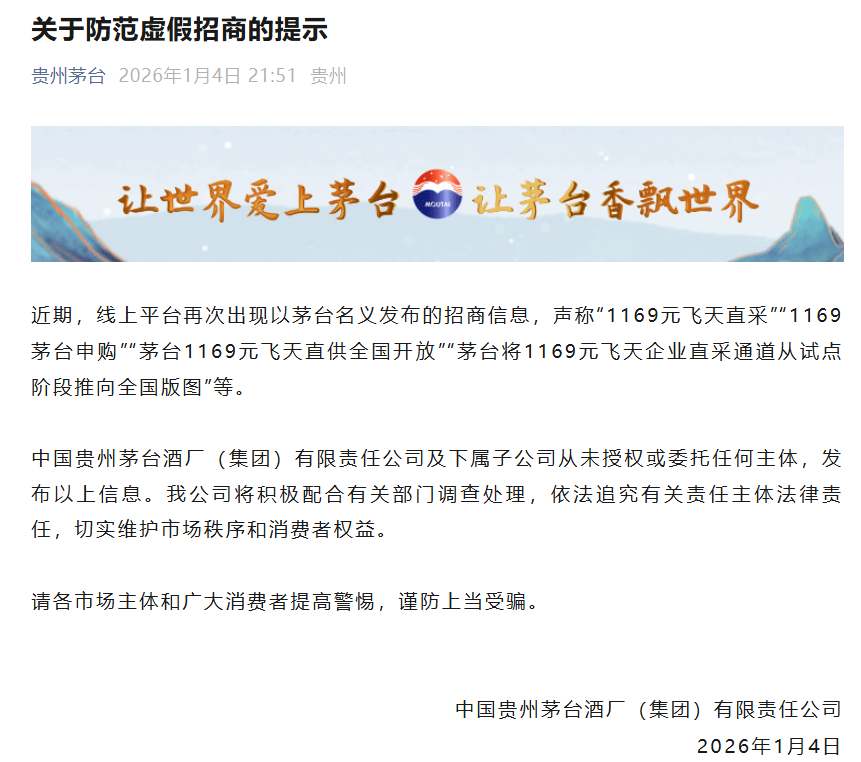 1月4日,“贵州茅台”微信公众号发布关于防范虚假招商的提示,内容如下: