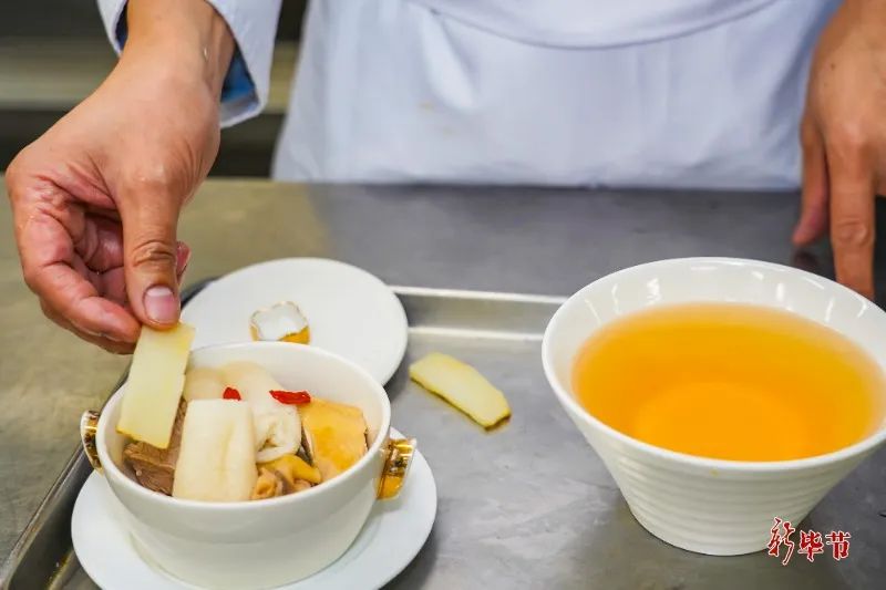 广州酒家的厨师将毕节天麻放入炖汤碗中