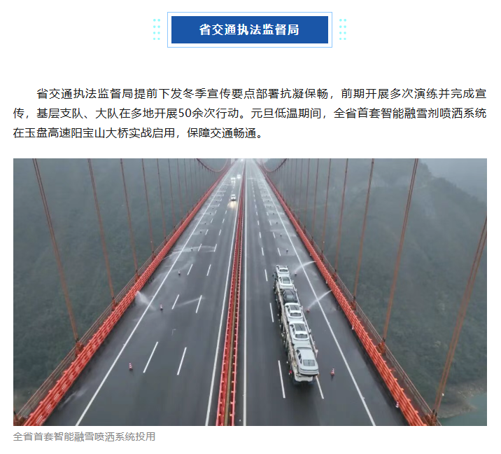 新年伊始,寒潮骤至,面对可能影响道路出行的低温凝冻天气,全省交通运输系统多家单位和企业第一时间启动低温雨雪天气保畅应急预案,“一路多方” 闻令集结、昼夜坚守保障平安,以迅速响应与硬核担当,打响新年抗凝保畅第一战。