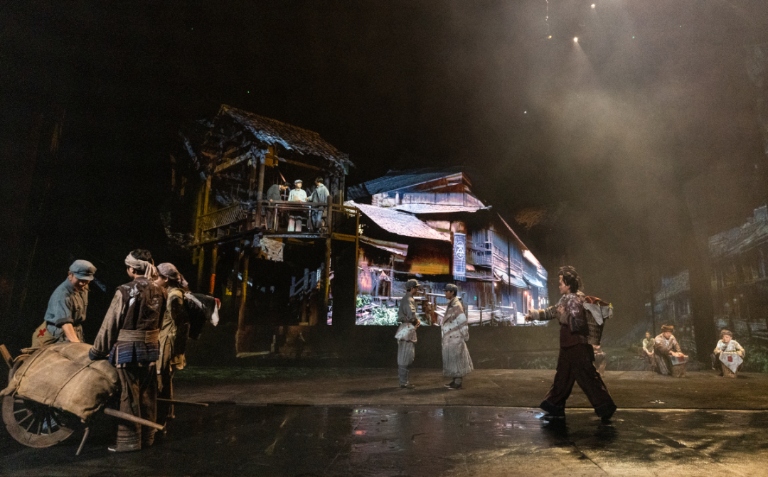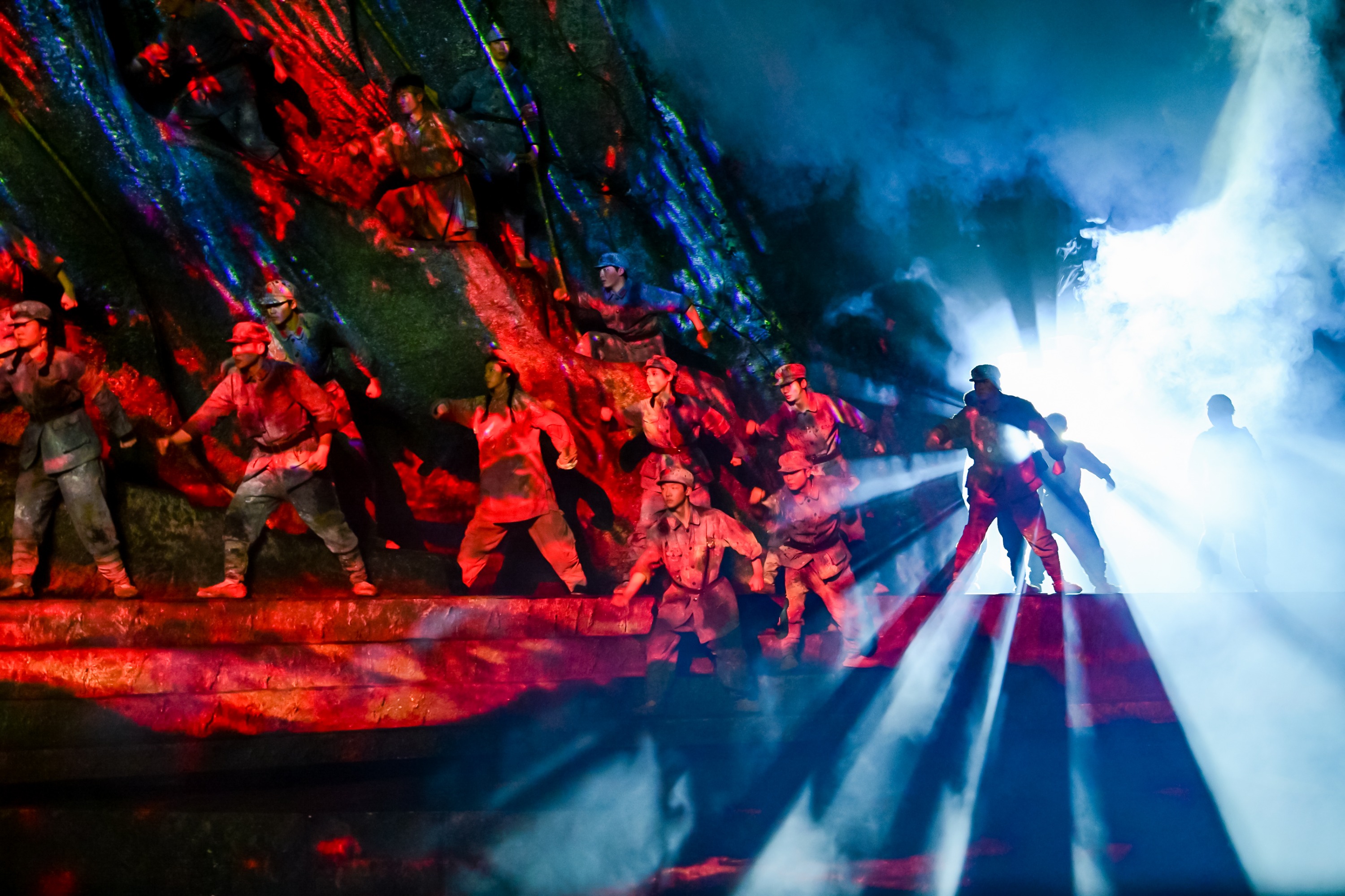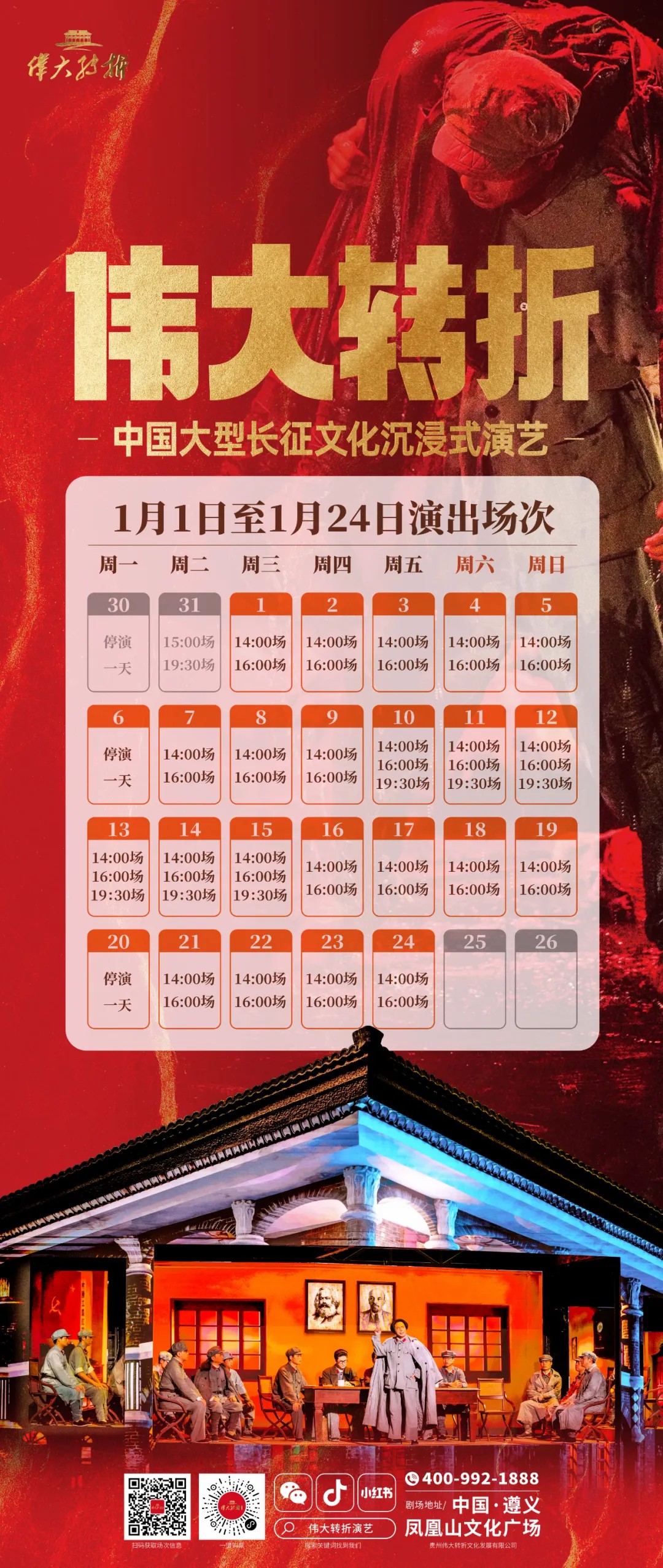 其中,《伟大转折》作为遵义全新的文化名片,是弘扬伟大建党精神、长征精神和遵义会议精神的重要载体,剧目以中央红军长征转战贵州期间,召开的以遵义会议为标志的一系列重要会议及四渡赤水等战斗战役为主线,中央红军血战湘江后,通道转兵,西入贵州,突破乌江,攻占遵义城,于1935年1月15日至17日召开了彪炳史册的遵义会议。而后,红军在毛泽东高超的军事指挥下,取得了战略转移中具有决定意义的胜利。以韩连长、二局报务员小露、军医小华佗为代表的红军普通官兵成长经历为辅线,塑造出红军指战员为信仰而战、为人民而死的壮烈而伟大的光辉形象。剧目承载了转折之城的红色历史、长征故事、峥嵘岁月,革命征途,利用科技和艺术融合的手段重现1935年波澜壮阔的革命年代,切实有效推动了“思政小课堂”有机融入“社会大课堂”。