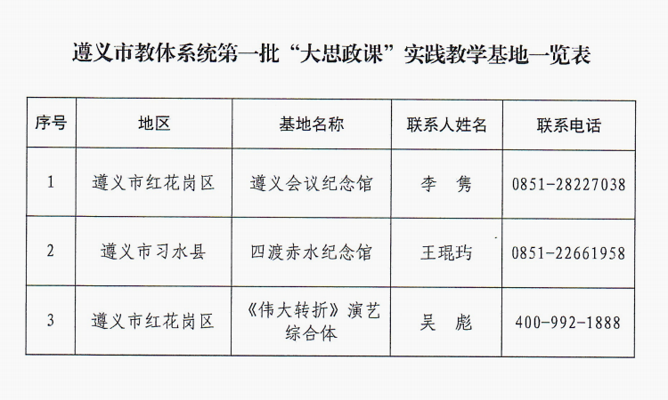 近日,遵义市委教育工作委员会、遵义市委宣传部、遵义市教育体育局发布《关于遵义市教体系统第一批“大思政课”实践教学基地授牌的通知》,为全市首批包括遵义会议纪念馆、四渡赤水纪念馆、《伟大转折》演艺综合体在内的“大思政课”实践教学基地授牌。