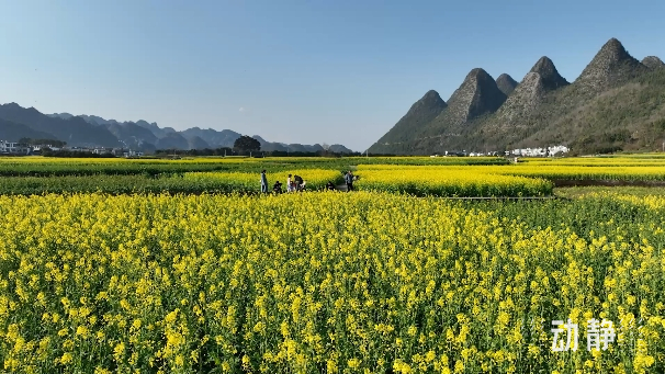 近日,贵州兴义万峰林的6000多亩油菜花竞相绽放,金黄色的花海与独特的喀斯特地貌交相辉映,吸引了众多游客前来赏花打卡。