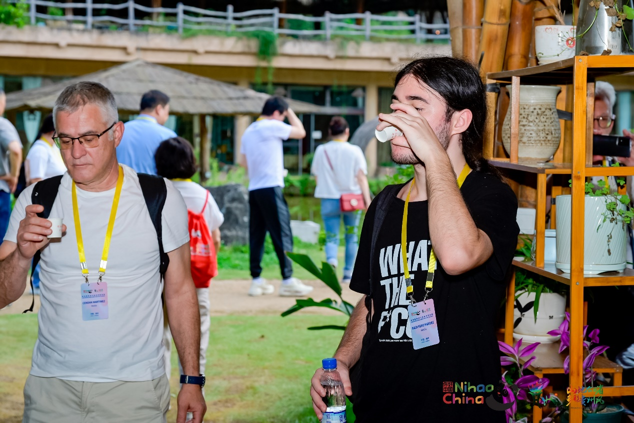 在当地瑶族导游的带领下,欧洲国家旅行商们品尝了瑶家香茅草茶。香茅草茶是瑶山古寨的特色茶饮,味道清爽,具有疏风解表、祛瘀通络、排毒养颜的功效。