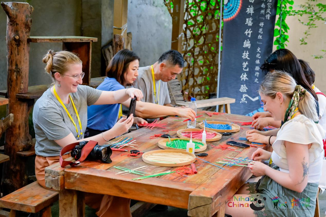 沿着瑶山古寨一路前行,欧洲国家旅行商来到竹编坊体验竹编工艺。欧洲旅行商们认真观看竹编工艺传承人的教学步骤,边学边做。不一会儿的功夫,一个个精美的竹编工艺品呈现在眼前,精美别致。