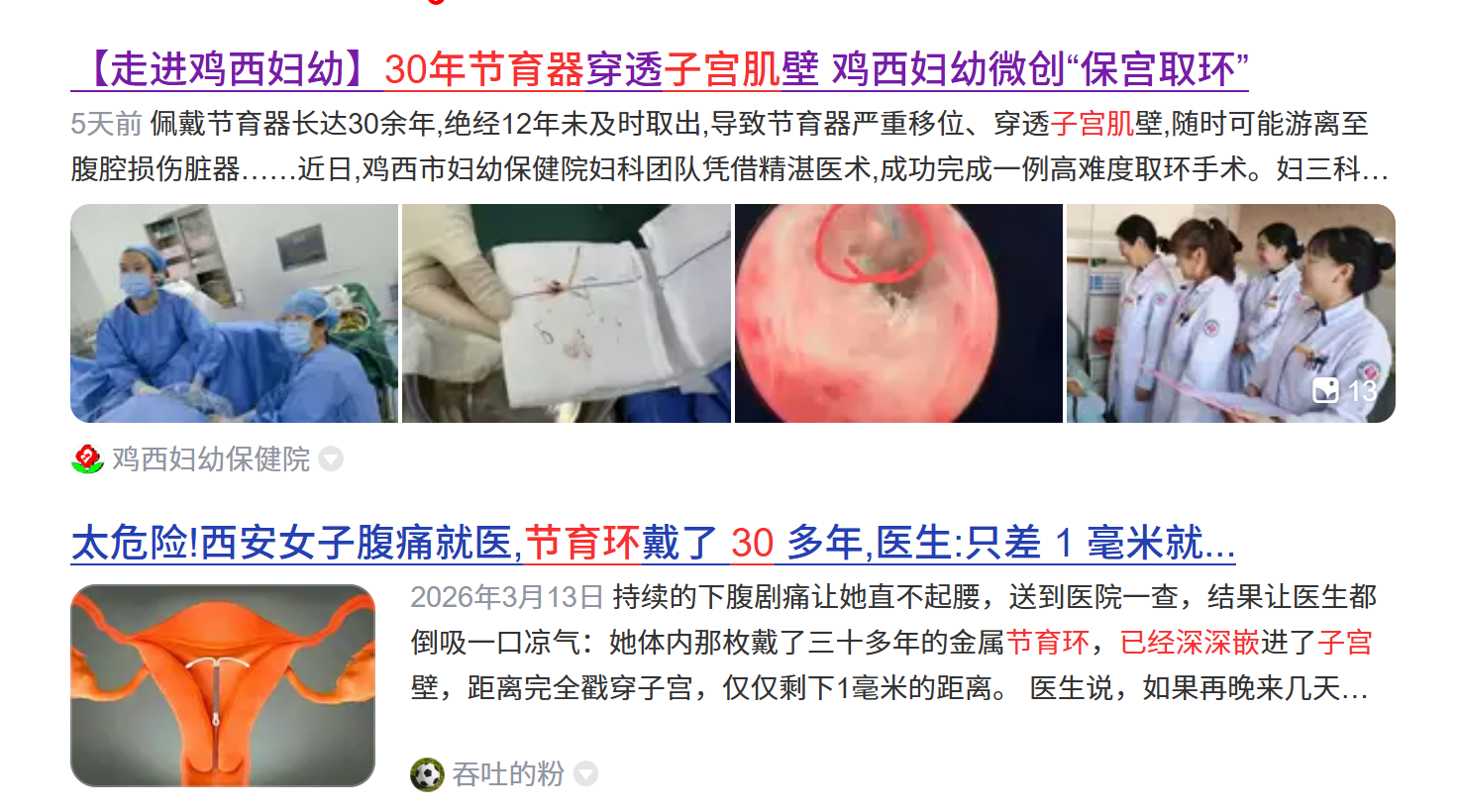 超期放置会增加嵌顿、移位、盆腔感染风险。绝经后更应在停经1年内取出,否则子宫萎缩后取环难度大幅上升。西安那位大姐的节育环服役30年,已远超使用年限,差点酿成大祸。