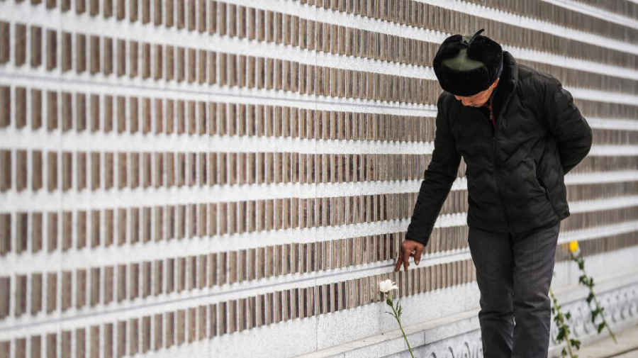4月4日,老人在贵州省贵阳市解放贵州革命烈士纪念墙前缅怀先烈。 新华社记者 陶亮 摄