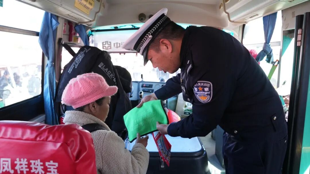 另一边,民警登上过往客车,仔细检查车辆安全设施,核验驾驶人资质,并向驾乘人员发放宣传资料,面对面讲解安全带使用、拒绝超员超载等出行常识。