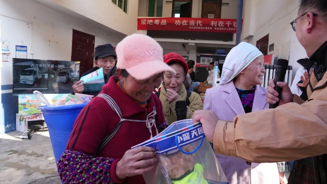 活动准备的印有交通安全宣传语的毛巾、围裙,以及洗洁精组成的厨房三件套,都是家家户户日常能用得上的实用好物,让村民们在获得“福利”的同时,也通过宣传品将交通安全理念送进群众家中。