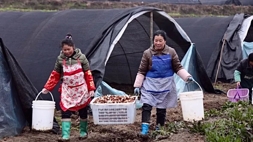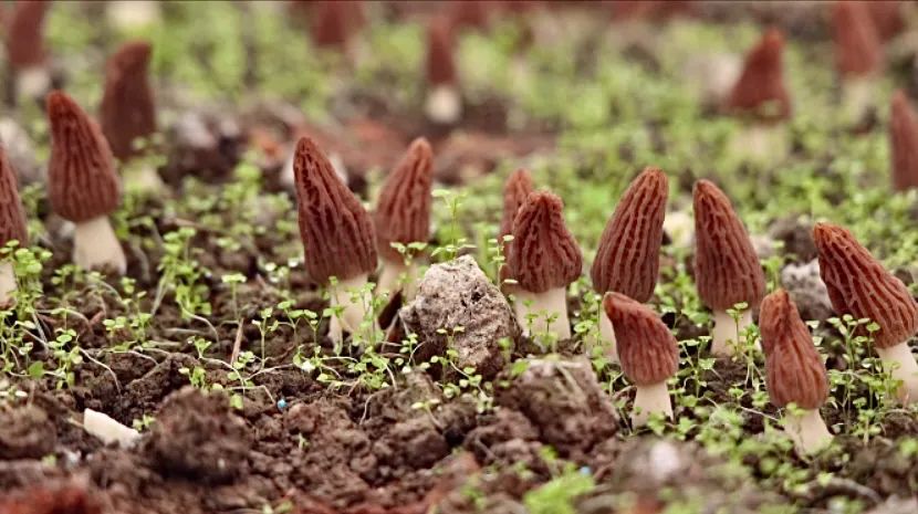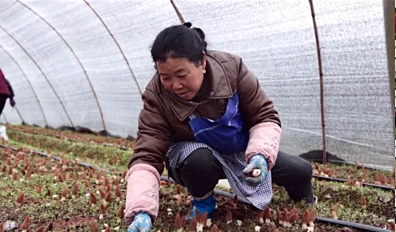 在整齐排列的菌床上,一朵朵褐色“小伞”破土而出。采摘工人们熟练地将羊肚菌从菌床上采下,去掉菌尾放入桶中,动作迅速且精准。