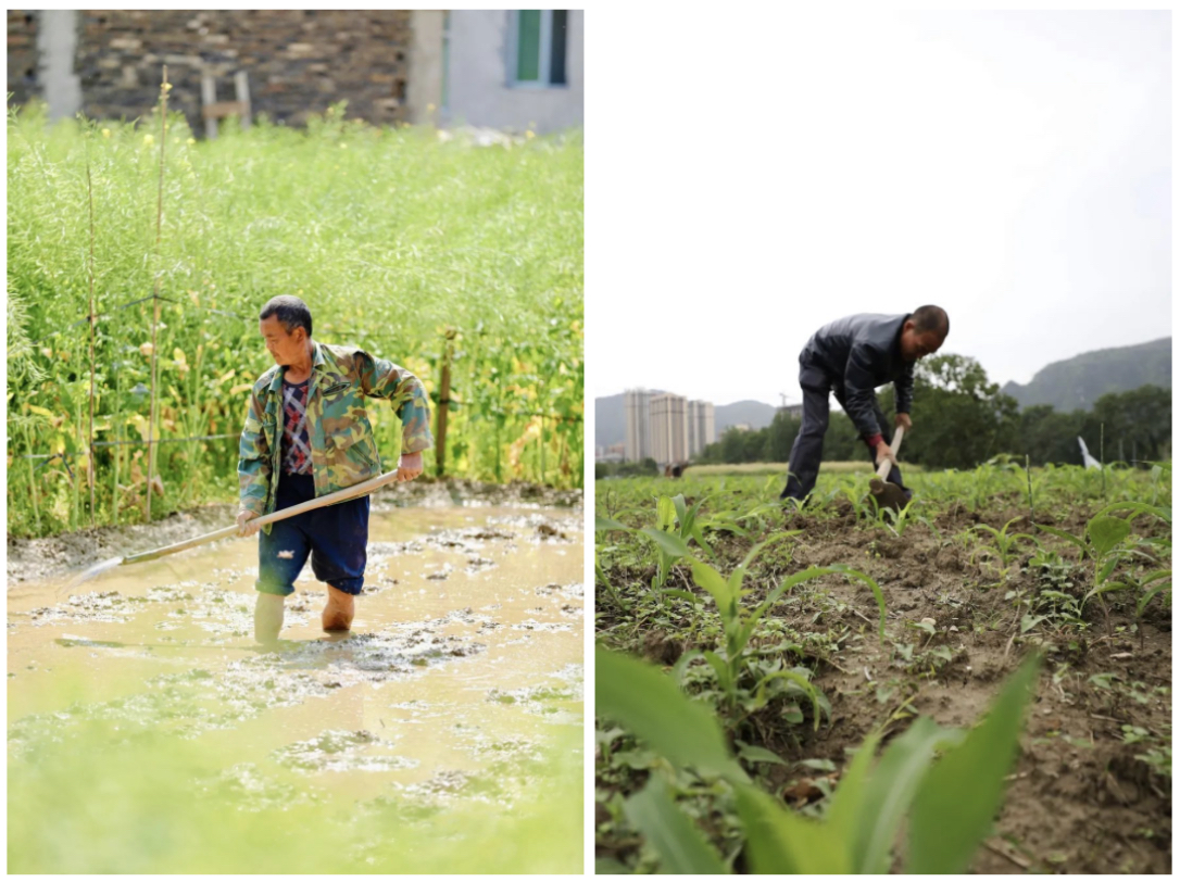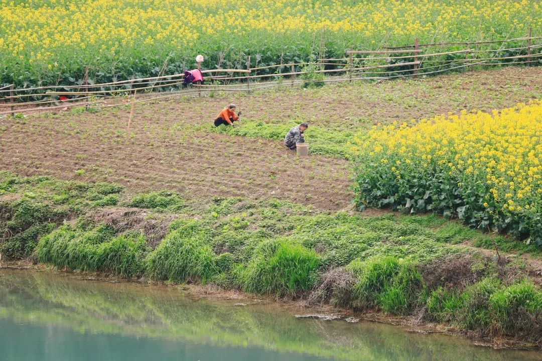 在江口,农民伯伯在田间辛勤播种时,也成为了景色的一部分。