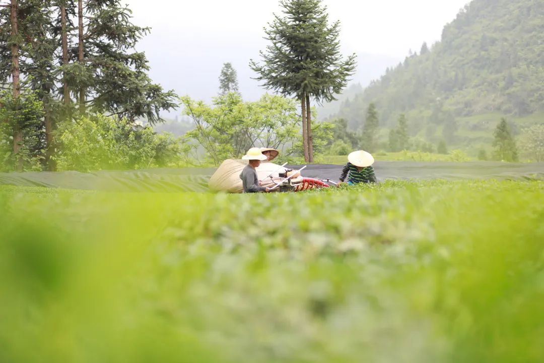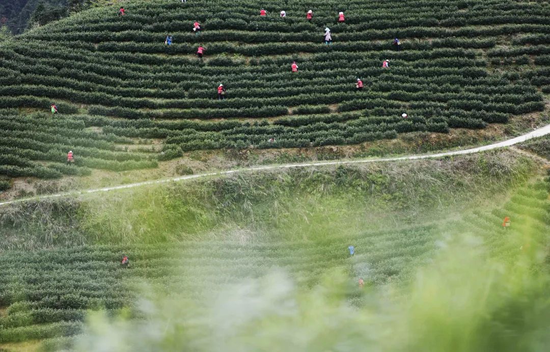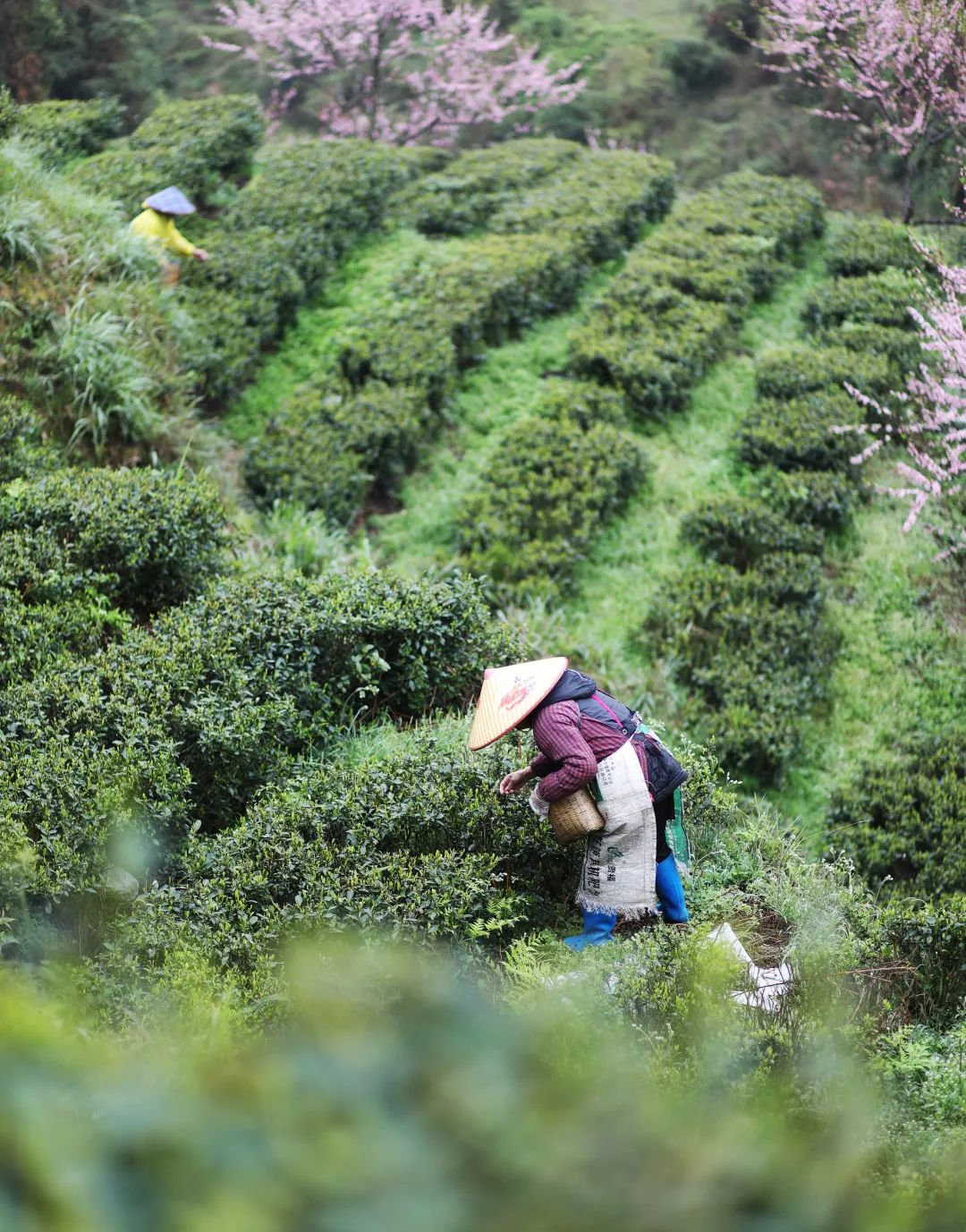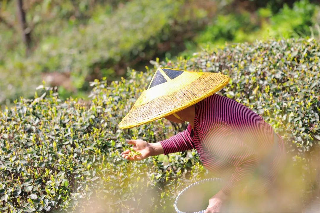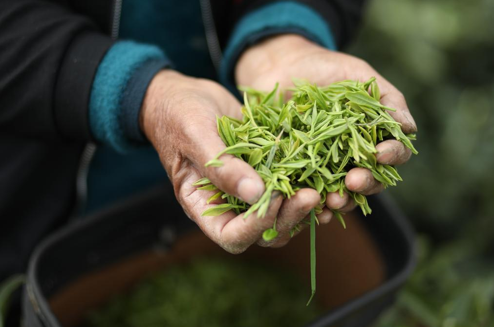 茶田间,采茶的茶农们正忙碌着,指尖轻触茶尖嫩芽,用拇指和食指轻夹茶芽,瞬间轻提,芽叶与枝,完美分离。