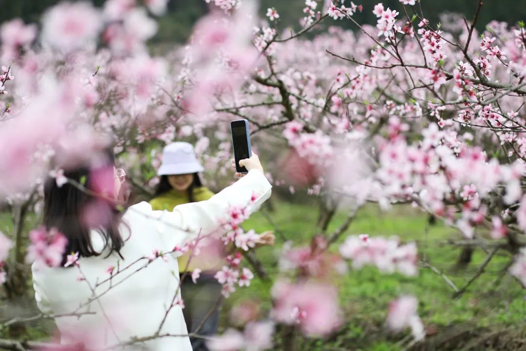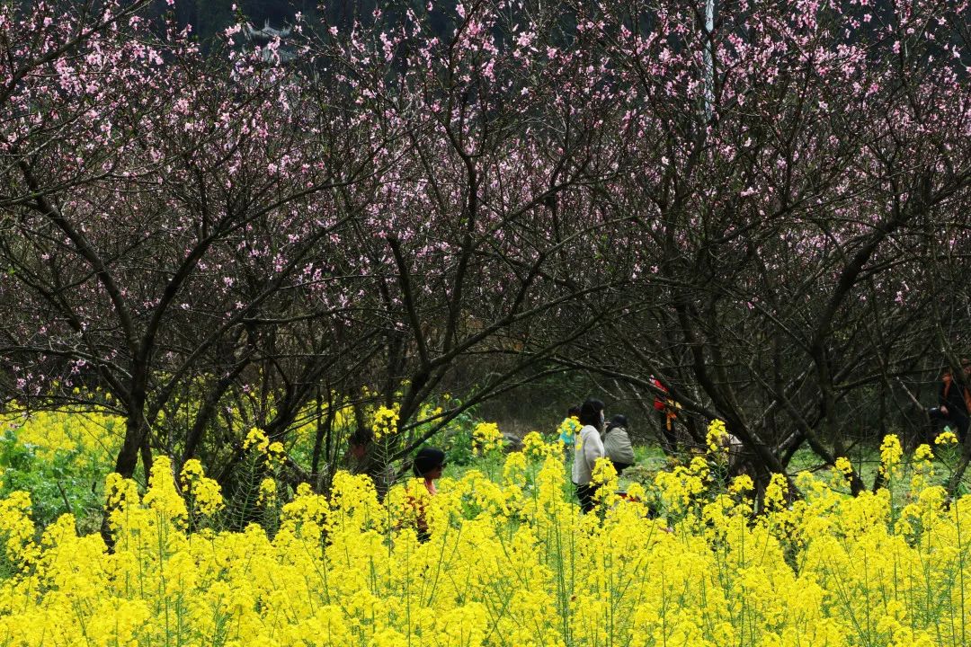 云蒸霞蔚的桃花林,在百花盛开的季节,桃花斗艳、油菜花成片开放,相映成趣。