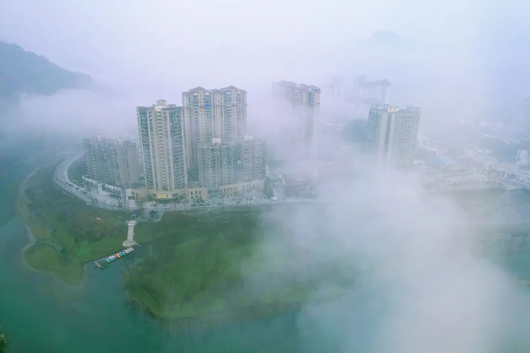 空中云雾迷蒙,一江春水,澄蓝澈底,两岸的山,袅娜迎人。