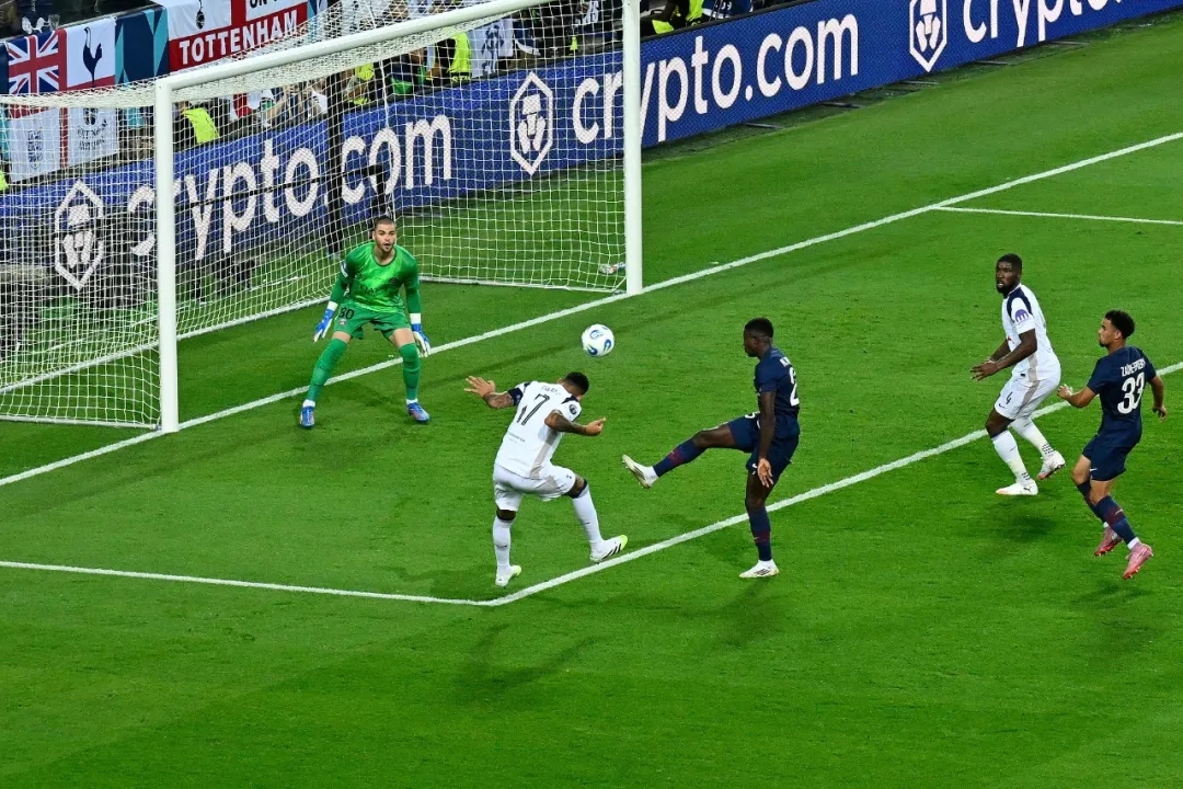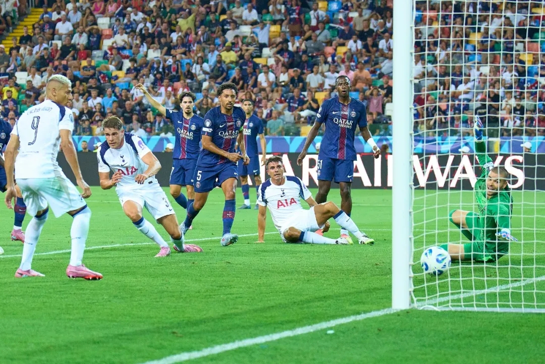 伤停补时阶段,巴黎圣日耳曼防线再次告急,理查利森禁区内头球摆渡,库杜斯门前接力鱼跃冲顶,可惜打在立柱上弹出。上半场,巴黎圣日耳曼控球率高达70%,但热刺更加高效,9次射门3次射正打进1球,带着1球优势进入更衣室。