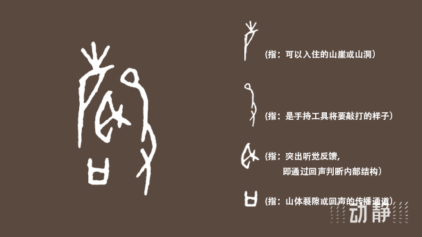 远古时代,人类还在山崖、山洞野居,入住之前他们是如何辨别安危呢?从“声”字的甲骨文字形来看,古人使用的方法可能就是“敲击法”——敲山辨险。