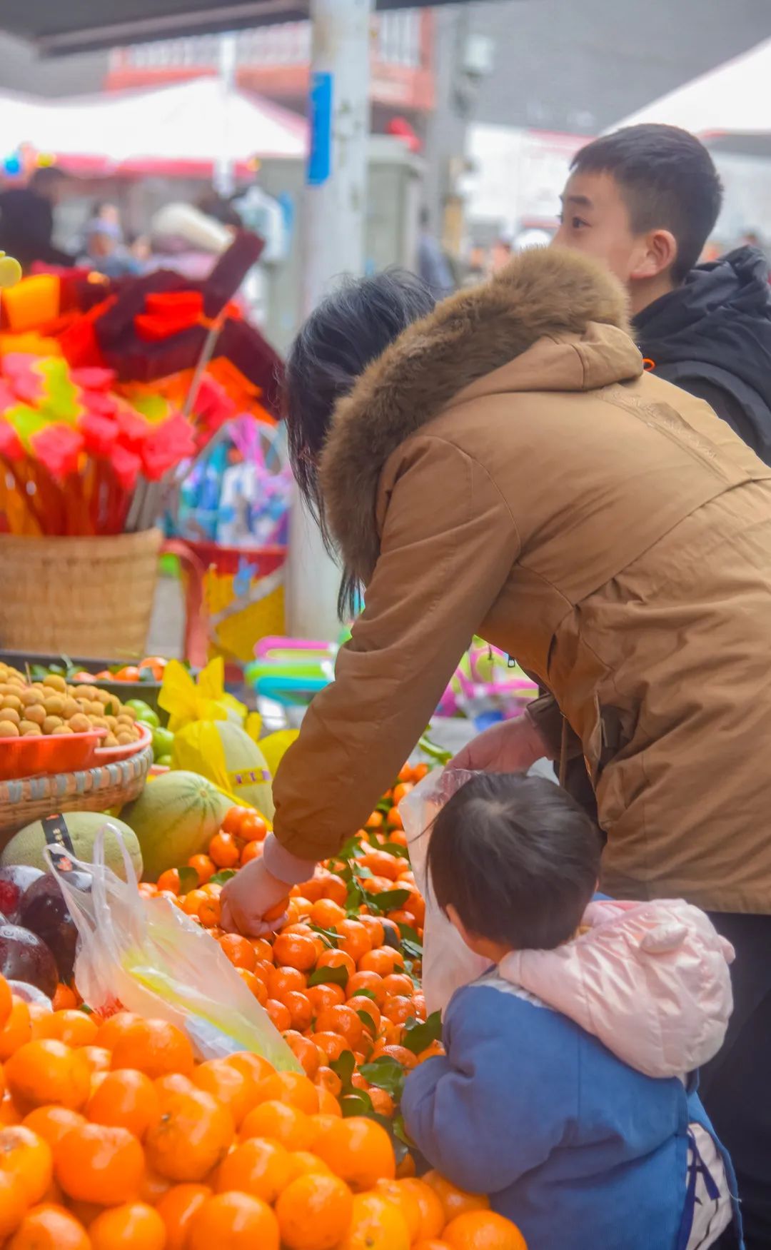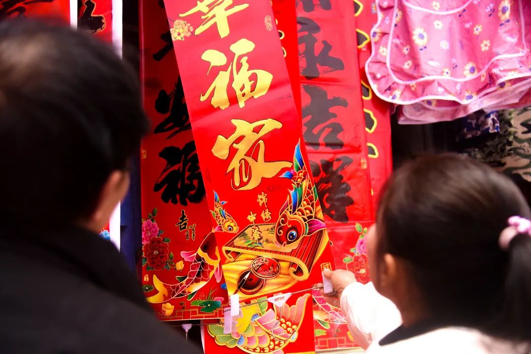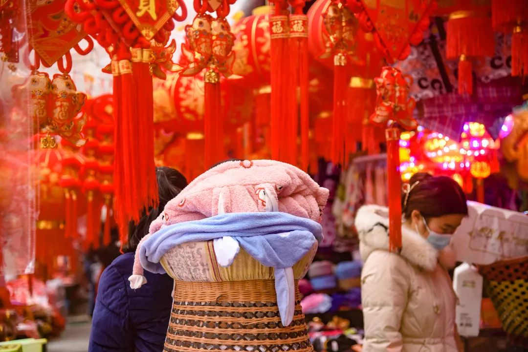 过新年挂灯笼是中国传统习俗,有了红灯笼就有了年味。大集上,灯笼摊、对联摊、福字摊……把集市的年味烘托到极致。