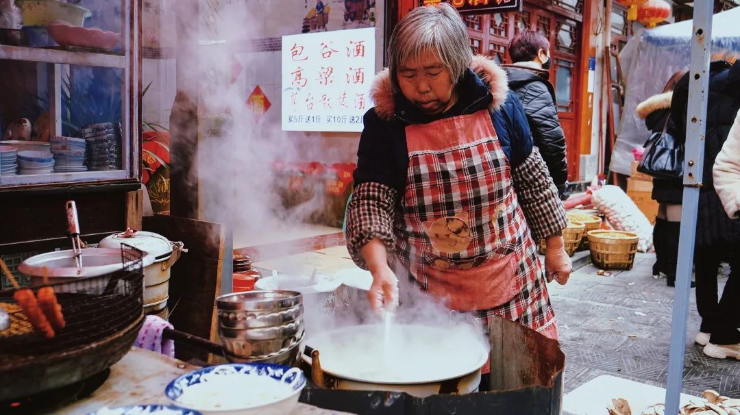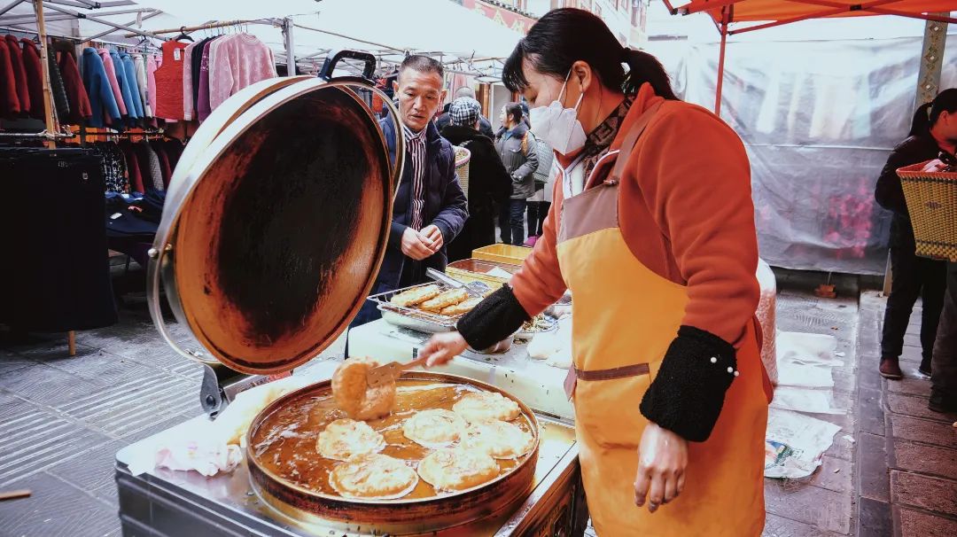 人声鼎沸的烟火处,别忘了吃一碗集市小摊上热气腾腾的粉面,来一口甜滋滋的麻花,好不惬意!