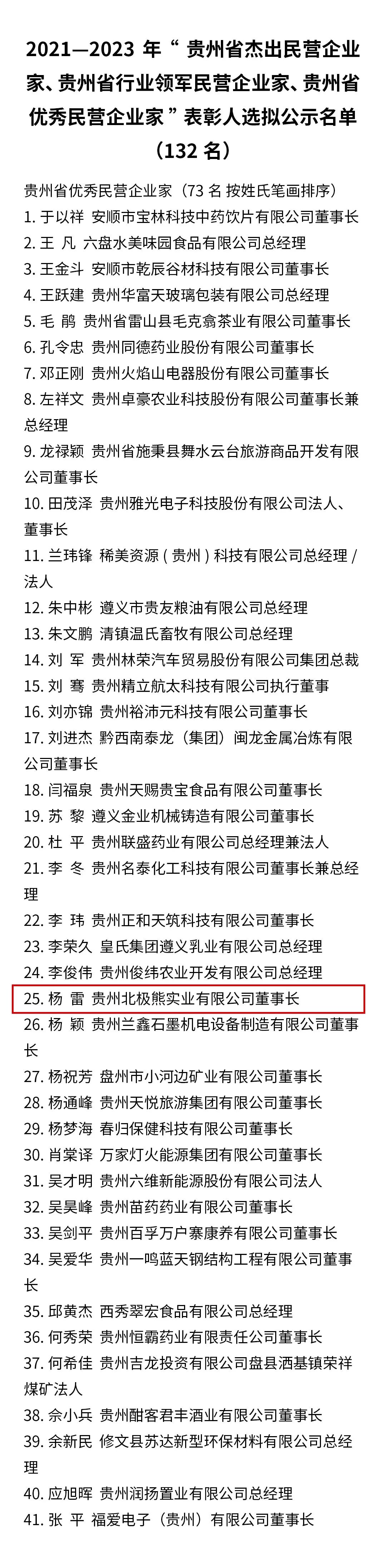 2月19日,经省委、省政府同意,以贵州省服务民营经济高质量发展工作领导小组名义表彰一批近年来在促进我省经济发展、推动创业创新、履行社会责任,以及投身东西部协作、粤黔协作产业帮扶方面表现突出的民营企业。在省直有关部门、各市(州)推荐的基础上,经审慎核实,贵州省服务民营经济高质量发展工作领导小组办公室研究提出了2021—2023年“贵州省杰出民营企业家、贵州省行业领军民营企业家、贵州省优秀民营企业家”拟表彰人选名单。