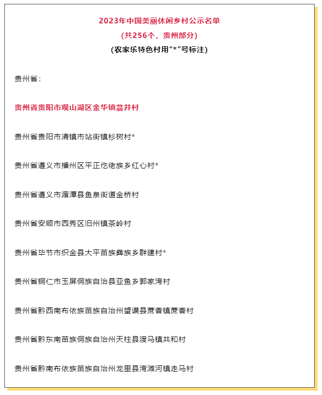 日前,农业农村部网站发布《2023年中国美丽休闲乡村名单公示》,拟推介北京市房山区张坊镇大峪沟村等256个村落为2023年中国美丽休闲乡村。其中,贵州有10个村入选,具体如下:
