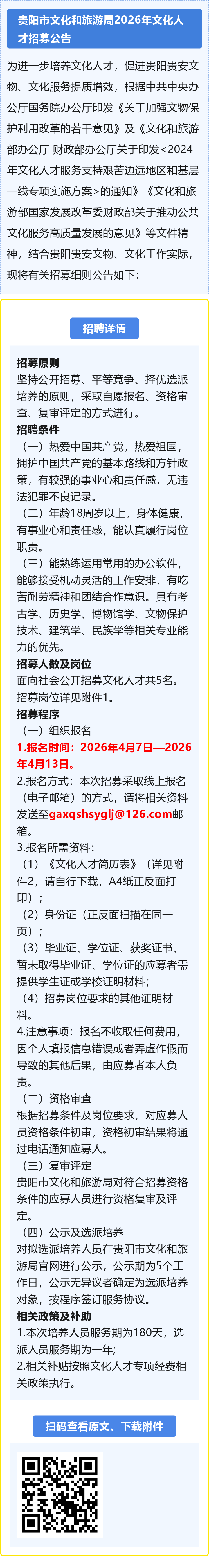 贵阳市文化和旅游局公开招募文化人才5名!报名截止时间:2026年4月13日!