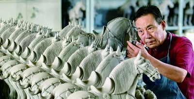 在南石山村的生产车间,高水旺对唐三彩泥胎进行雕塑加工。延婧 摄