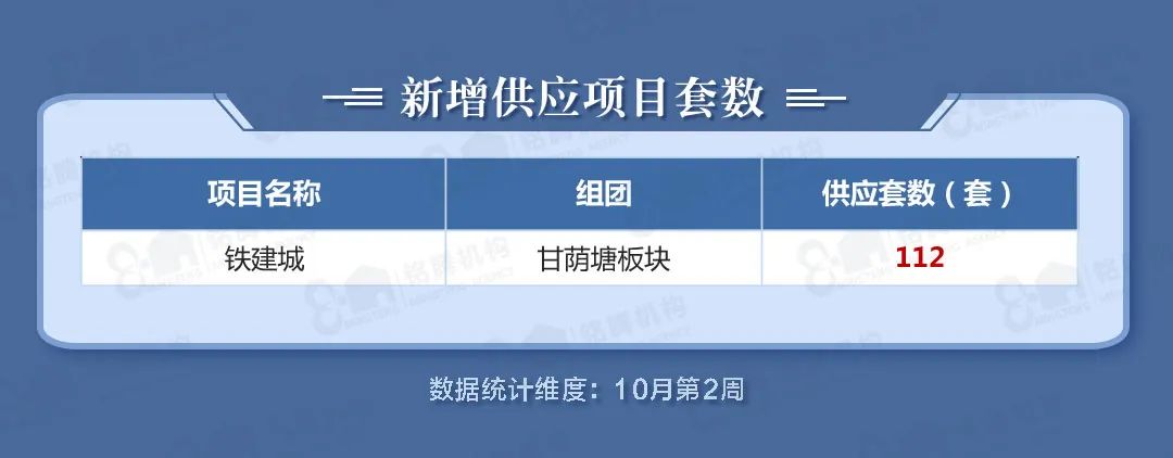 根据铭腾机构数据显示,上周(10.2-10.8)贵阳新增供应1.43万㎡,合计112套,单盘供应,即铁建城供应套数为112套。