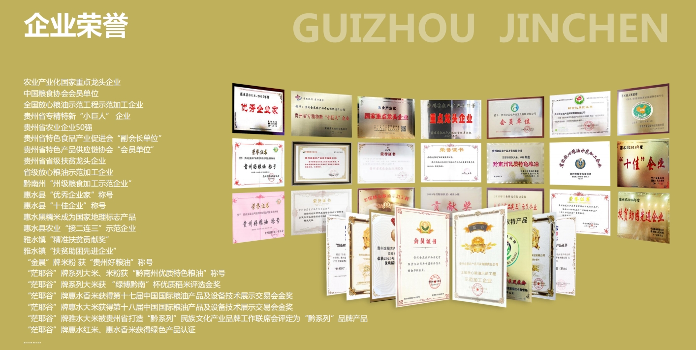 贵州省农业产业化经营重点龙头企业、贵州省省级扶贫龙头企业、金晨牌米粉被评为贵州省名牌产品、茫耶谷牌大米获得贵州省名牌产品中国好粮油行动示范企业 国家级重点物资保障。